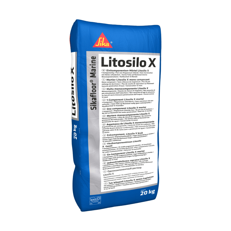 Sikafloor Marine Litosilo X is a 1-component medium weight high strengths levelling mortar based on polymer modified cement with excellent flame resistance. Per 20 kg bag at layer thickness 1 mm/13 m2. Floating floor application thickness: 25 - 100 mm. See product data sheet for more information.