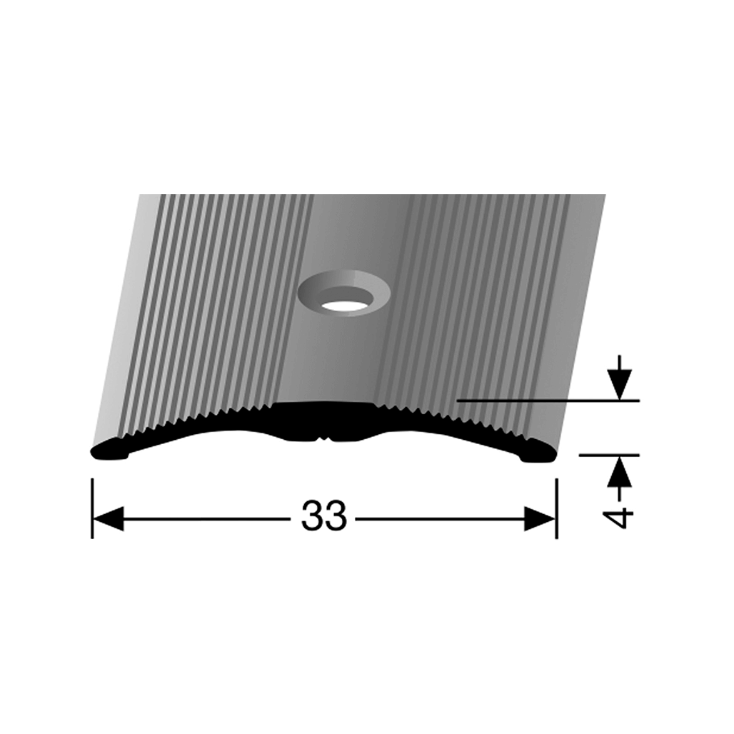 Transition profile made of Aluminium with a width of 33 mm. Drilled countersunk in the center. With decorative grooves. Assembly: screwing with Torx screws 3.0 mm. Screws 3.0. Other colors and powder coating in RAL colors possible on request. Custom-made cuts possible on request.