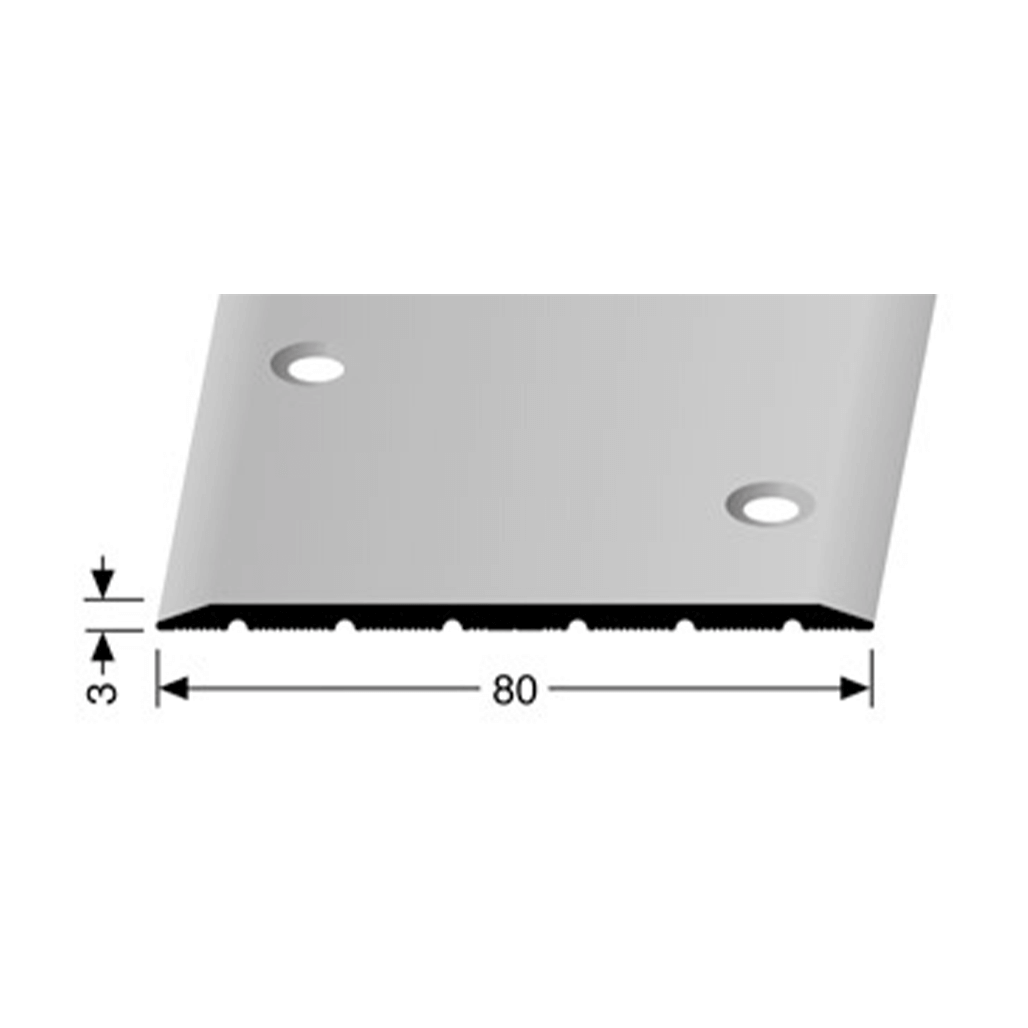 Transition profile made of Aluminium with a width of 80 mm. Offset drilled, countersunk. Mounting: screws with Torx screws 3.5 mm. Screws 3.5. Other colors and powder coating in RAL colors available on request. Customization possible on request.