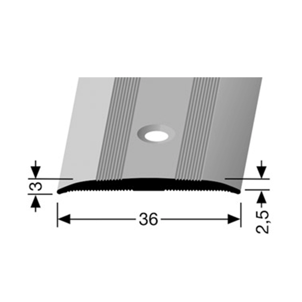 Transition profile made of Aluminium with a width of 36 mm. Drilled countersunk in the center. With decorative grooves. Assembly: screwing with Torx screws 3.0 mm. Screws 3.0. Other colors and powder coating in RAL colors possible on request. Custom-made cuts possible on request.